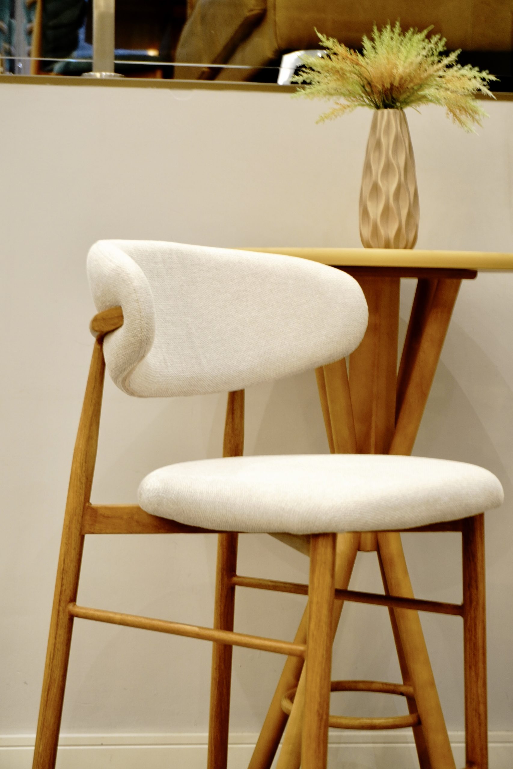 O conforto fica por conta do revestimento, disponível em linho (toque agradável, aparência natural e versatilidade na decoração) ou em courino (fácil de limpar e ideal para a rotina). Com proporções bem resolvidas para bancadas e ilhas, a Lucy entrega apoio confortável e praticidade no uso diário.