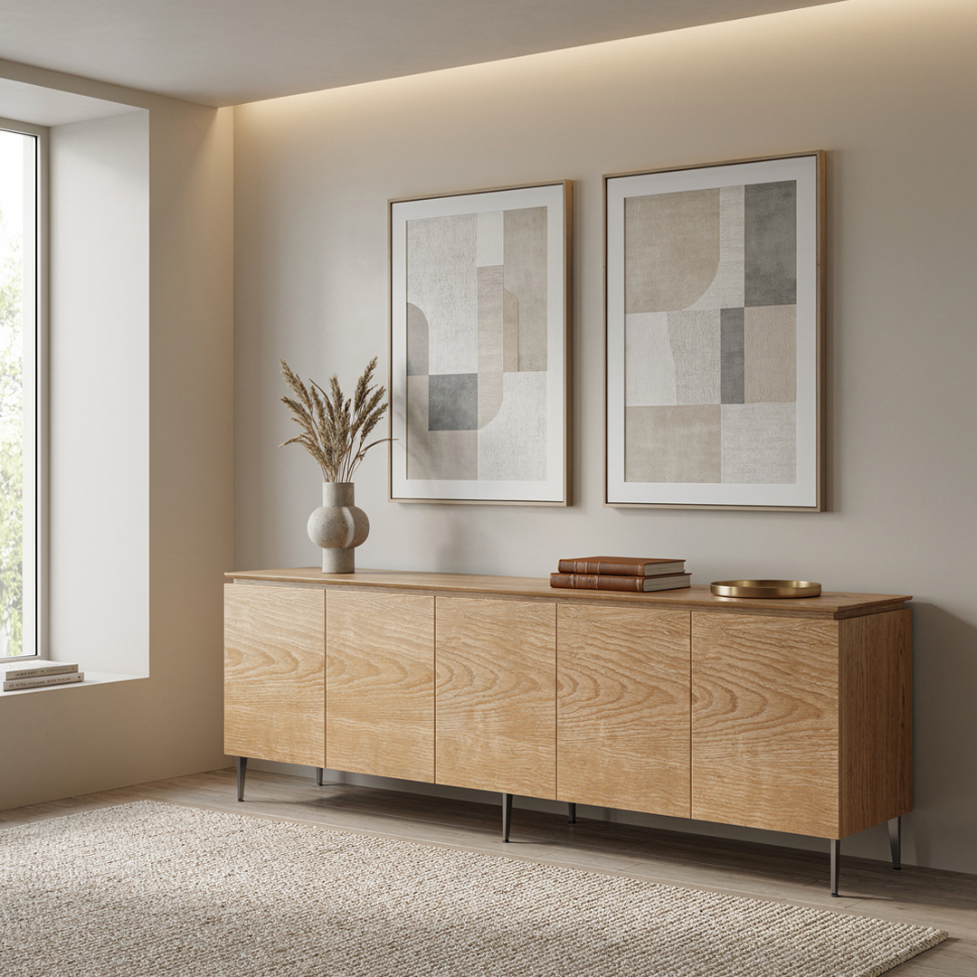 Com linhas limpas e portas que valorizam a textura natural da madeira, o Balcão Levi se destaca pelo estilo atemporal que combina facilmente com diferentes propostas de decoração — do minimalista ao moderno. Sua base elevada e estrutura leve proporcionam uma sensação de amplitude ao espaço, enquanto o amplo interior oferece excelente solução de armazenamento para louças, objetos decorativos e itens do dia a dia.